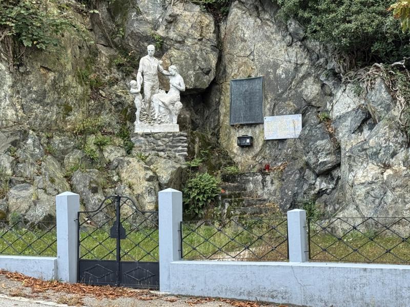 Beschreibung des Objekts (Deutung, Material und Technik) | Die einzelnen Elemente des Denkmals sind in eine anstehende Felswand eingegliedert. Der mit Immergrün überwachsene Stein und der angrenzende Wald bringen Natur und Leben in die Szenerie. Hauptbestandteil des Denkmals ist eine Figurengruppe aus Kunststein mit drei Personen: Ein Soldat nimmt Abschied von seiner Frau und seinem Kind. Eine Kupfertafel mit den Namen von zehn zwischen 1914 und 1918 gefallenen Ortsbewohnern und eine Marmortafel mit sechsundzwanzig Namen von im Zweiten Weltkrieg gefallenen und vermissten Soldaten bilden ein weiteres Element des denkmalgeschützten Ensembles. |