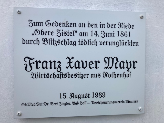 Ursprungsdaten, Chronik: (Zeit und Ursache der Errichtung bzw. Überlieferung, Namen der Urheber, Künstler bzw. Handwerker, Sanierungen) | Der Bildstock wurde zur Erinnerung an Franz Xaver Mayr errichtet, der in der Flur "Obere Ziestel" am 14. Juni 1861 durch Blitzschlag tödlich verunglückte. Das Mayr-Marterl wurde im Zuge der Bauarbeiten für den Abwasserkanal des Flaklagers Mautern im Jahr 1938 zerstört. Im Jahr 1989 erfolgte, nach altem Vorbild, aber in stark vereinfachter Form, die Neuerrichtung durch den Verschönerungsverein Mautern unter dem Obmann Günter Gittenberger. Im Jahr 2025 wurde der Bildstock von Fritz Stegmeier mit Unterstützung durch Josef Pischinger renoviert und teilweise farblich neu gestaltet. |