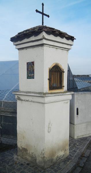 durch zwei Gesimse gegliedert und hat ein Zeltdach mit Kreuz. An der Vorderseite befindet sich eine mit einem Eisengitter verschlossene Nische, in der kleine Devotionalien aufbewahrt werden. Seitlich sind Mosaike angebracht.