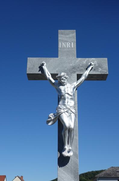Das Kreuz aus Wachauer Marmor steht auf einer quadratischen Fundamentplatte mit einem aufgesetzten, niedrigen gestockten Sockel, auf dem ein schmälerer hoher glatter Sockel die Basis für das Steinkreuz bildet. Auch der Korpus des Gekreuzigten in der 4-Nagel Technik ist aus Wachauer Marmor gefertigt.