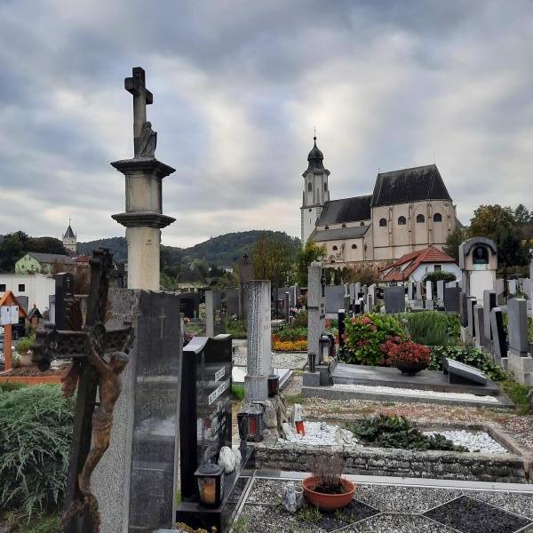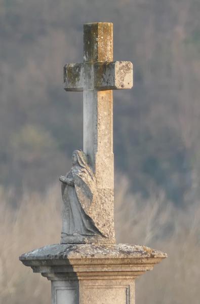 | Beschreibung des Objekts (Deutung, Material und Technik) | Dieser Blockpfeiler dürfte aus grauem Kalkstein gefertigt sein und steht auf einem abgestuften Postament. Auf der tieferen Deckplatte befindet sich ein prismatischer Oberteil mit vier schwach vertieften Feldern. Auf der oberen Deckplatte steht ein Steinkruzifix, zu dessen Füßen eine Frauenfigur – wahrscheinlich eine Madonna – steht. Der Pfeiler im Friedhof mit dem Quaderaufsatz auf einem abgefasten Pfeiler und einem Kreuz mit einer Frauenfigur dürfte vermutlich von einer Kreuzigungsgruppe aus dem 17. Jahrhundert stammen. |