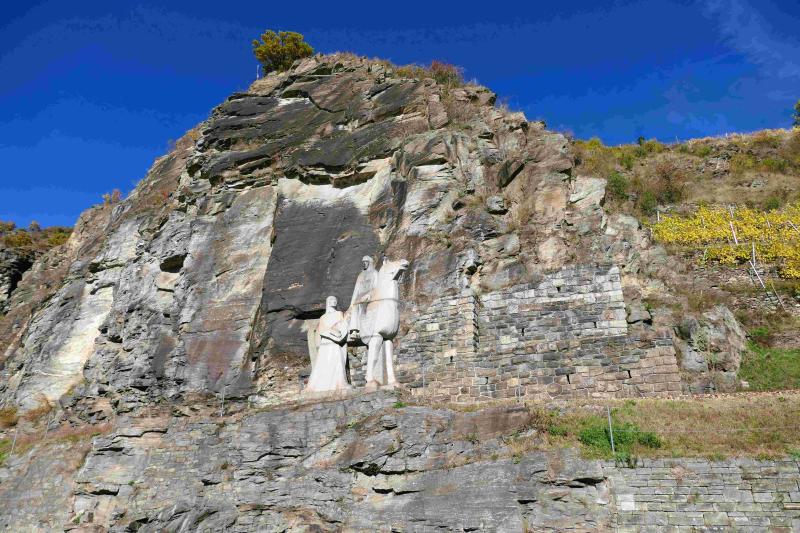 | Ursprungsdaten, Chronik: (Zeit und Ursache der Errichtung bzw. Überlieferung, Namen der Urheber, Künstler bzw. Handwerker, Sanierungen) | Gegen Ende der 1950er Jahre wurde die Bundesstraße an der nördlichen Uferseite der Donau fertiggestellt. So wurde an dieser Stelle zwischen Donauuferbahn | Wachaubahn aus dem Jahre 1909 und Bundestraße 3 ein für die Region herausragendes Monument geschaffen. Alois Lidauer, ein über die Grenzen hinaus bekannter Bildhauer ist der Schöpfer dieses schon von weitem sichtbare Denkmal. Man erkennt einen Kreuzritter auf dem Pferd und einen Minnesänger mit Laute. Aufgrund des Wappenschildes der Kuenringer im Standbild leitet man die oft erwähnte Reflexion von einer musischen und wehrhaften Wachau ab. Zugleich werden auch Richard Löwenherz mit Sänger Blondel im Standbild gesehen. Bildhauer, Alois Lidauer ist 1908 im Innviertel geboren und 1975 in Salzburg verstorben. |