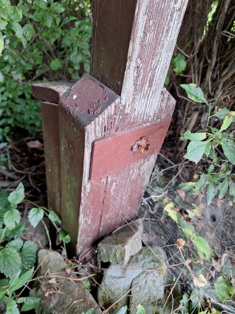 Das Holzkreuz sollte geschliffen und gestrichen werden, die Sträucher soweit zurückgeschnitten, dass es zur Geltung kommt. |