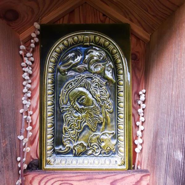 | Beschreibung des Objekts (Deutung, Material und Technik) | In Unterthalheim steht an der südlichen Außenfassade vom Wohnhaus der Familie Lahmer ein Marterl aus Holz. Im geschützten Innenbereich vom Gehäuse reflektiert ein Jesusporträt mit Dornenkronen aus einer glasierten, gebrannten Kachel. Die Kachel hat eine Höhe von 35 cm und eine Breite von 22 cm |