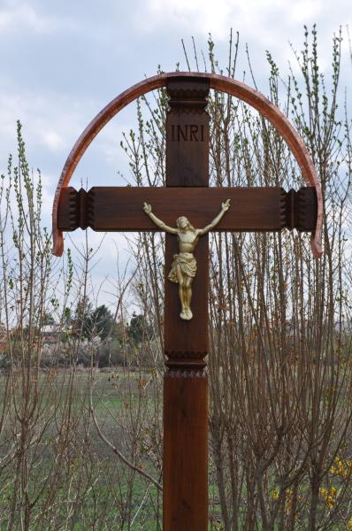 | Beschreibung des Objekts (Deutung, Material und Technik) | Holzkreuz aus massiver Eiche, Christusfigur aus Guss und gold bemalt mit einem Kupferdach, freistehend auf einem Steinsockel und Anschluss zur Straße Granit gepflastert. |