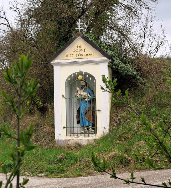 | Beschreibung des Objekts (Deutung, Material und Technik) | Ein gemauerter Kapellenbildstock mit Dreiecksgiebel aus dem Ende des 19. Jahrhunderts befindet sich im Privatbesitz der Familie Stippinger. Er wird laufend von der Familie instand gehalten. Im Kapellbildstock befindet sich eine polychrome, barocke Figur des heiligen Josef mit dem Jesukind auf dem Arm. Eine Eisenstabtür bildet die physische Abgrenzung nach außen. In der Giebelfläche kann man folgenden Spruch lesen: Hl. Josef Bitt' für uns! |