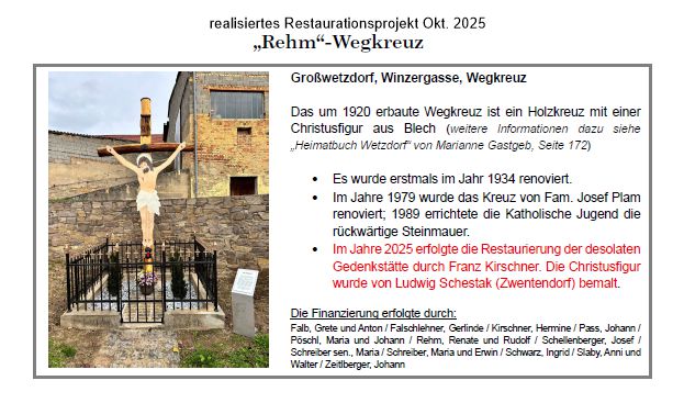 | Chronik - allfällige Ergänzungen: (z.B. Sagen, Legenden, Überlieferungen ausführlicher) | 9.3 Allfällige Ergänzungen (Sagen, Legenden, Überlieferungen – ausführlicher) Da die beiden Besitzer Ing. Leopold und Brigitte Strell nichts zur Instandhaltung machten, hatte sich Holzschnitzer Franz Kirschner, der Restaurierung der desolaten Gedenkstätte angenommen. Die Christusfigur wurde von Ludwig Schestak (Zwentendorf) bemalt! Die Finanzierung erfolgte durch Spenden von Grete u. Anton Falb, Gerlinde Falschlehner, Hermine Kirschner, Johann Pass, Maria u. Johann Pöschl, Renate u. Rudolf Rehm, Josef Schellenberger, Maria Schreiber sen., Maria u. Erwin Schreiber, Ingrid Schwarz, Anni u. Walter Slaby, Johann Zeitlberger! Neue Adresse der Besitzer ab April 2022: Roßweide 13! |