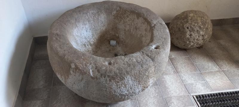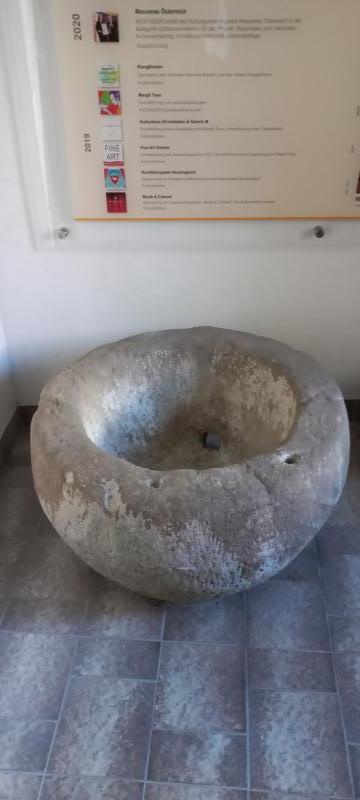Das aus Stein gefertigte Becken ist mit einer Ablassöffnung versehen und steht beim Eingang des Museums Neulengbach.