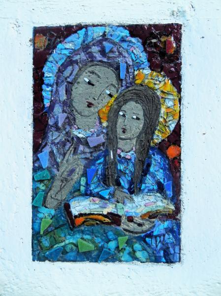 durch zwei Gesimse gegliedert und hat ein Zeltdach mit Kreuz. An der Vorderseite befindet sich eine mit einem Eisengitter verschlossene Nische, in der kleine Devotionalien aufbewahrt werden. Seitlich sind Mosaike angebracht.