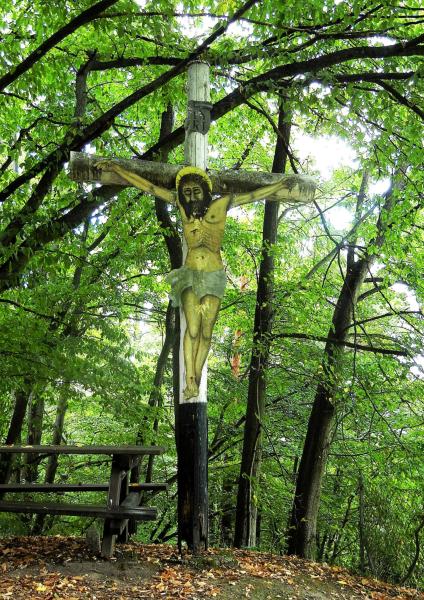 Beschreibung des Objekts (Deutung, Material und Technik) | Freistehendes Kreuz aus weißgestrichen Halbstammteilen, mit lebensgroßem, bemalten Korpus Christi aus Aluminiumblech geschnitten. Das Wegkreuz steht am Ende des Fuchsleitengrabens im Waldgebiet des Schabergs. Von hier führt in südlicher Richtung ein Wanderweg zum Roten Kreuz. |