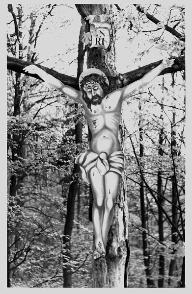 Freistehendes Kreuz aus weißgestrichen Halbstammteilen, mit lebensgroßem,