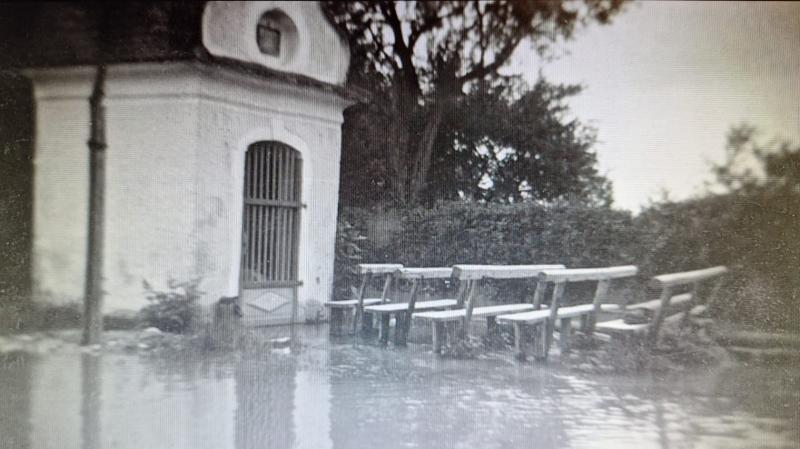 In einem Revers vom 17.2.1727 wurde die Bewilligung zur Sanierung des Kreuzes und Errichtung einer Kapelle beantragt. Diese wurde angeblich aufgrund der Verschonung vom Hochwasser von 2 Frauen, auf dessen Grund das Kreuz stand, finanziert.