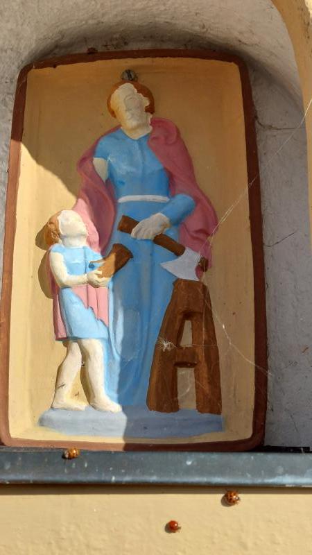 Beschreibung des Objekts (Deutung, Material und Technik) | Gemauerter Pfeiler mit einer aufgesetzten Kapelle mit einer torbogenförmigen Ausnehmung, in der sich ein Keramikbild des hl. Josef befindet. Ein Walmdach aus Kupferblech schützt den Bildstock vor der Witterung. |
